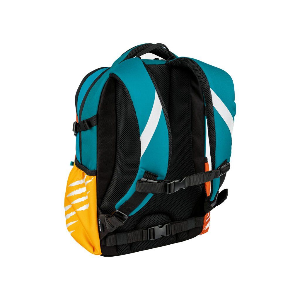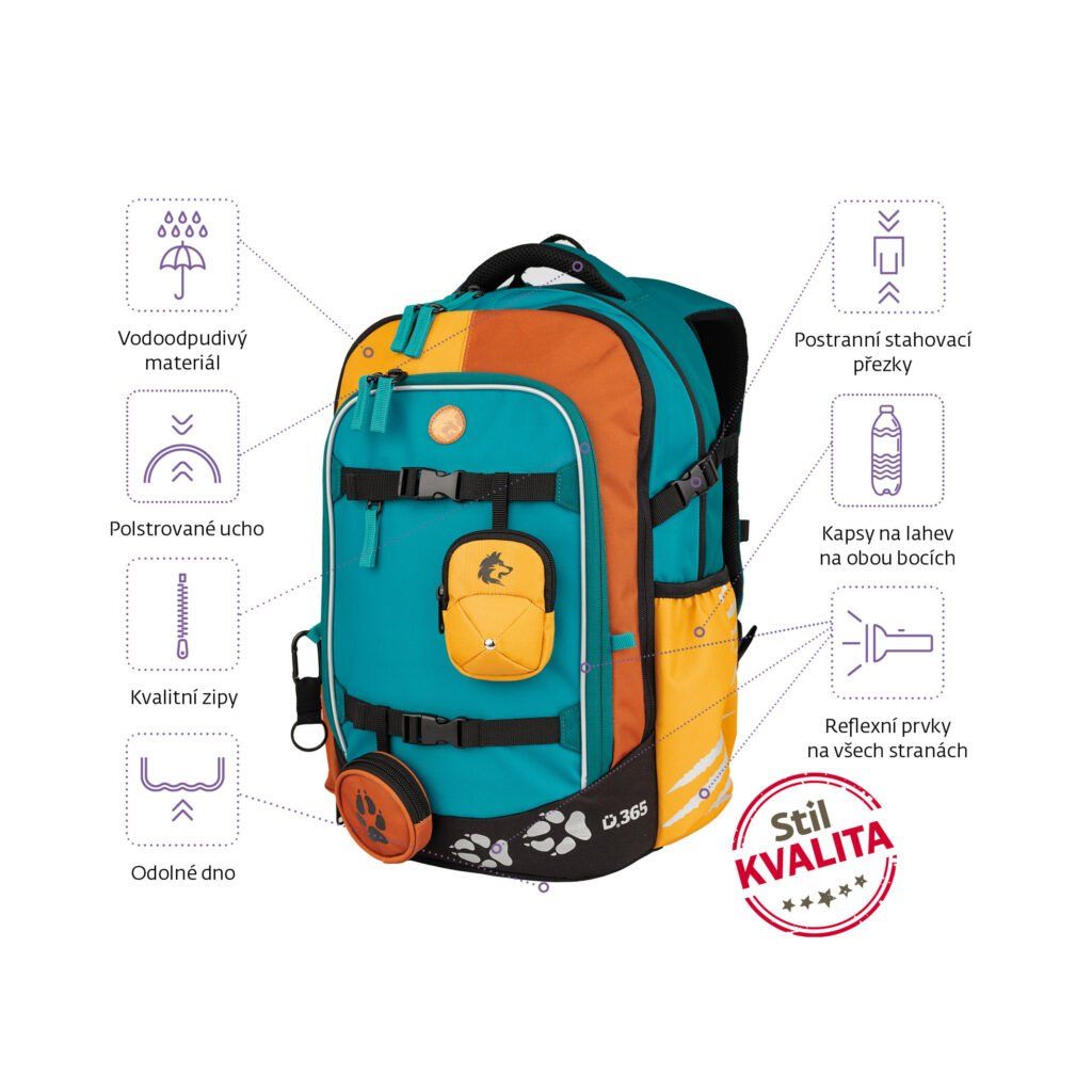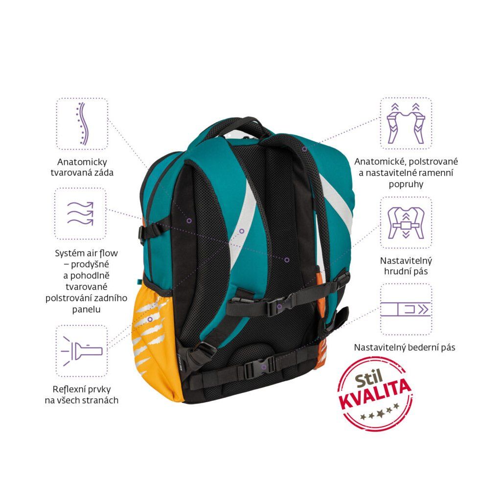 A formatervezés a következőket tartalmazza biztonsági fényvisszaverő elemek minden oldalon elhelyezve, hogy a gyermek jobban látható legyen sötétben és szürkületben egyaránt. A hátizsák víztaszító anyag (100% poliészter) és megerősített vízálló fenék hogy megvédje a tartalmat a nedvességtől és a szennyeződésektől. Köszönhetően rejtett zsebek az értéktárgyak számára a tágas kamrák a hátizsák elegendő helyet kínál a nagyobb A4-es tankönyvek számára. A fő- és középső rekeszek ehhez a formátumhoz igazodnak, az elülső zsebben pedig praktikus szervezőt találsz az apróságok, kulcsok és iskolai felszerelések számára.