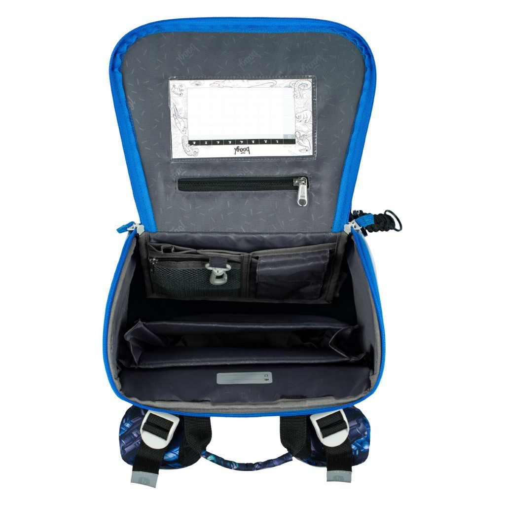Belső szervező: az aktatáska egy átlátszó szervezőt tartalmaz az órarend számára, valamint egy további, rugalmas pánttal ellátott zsebet a dolgok rögzítéséhez, amely biztosítja a súly egyenletes eloszlását a belsejében.