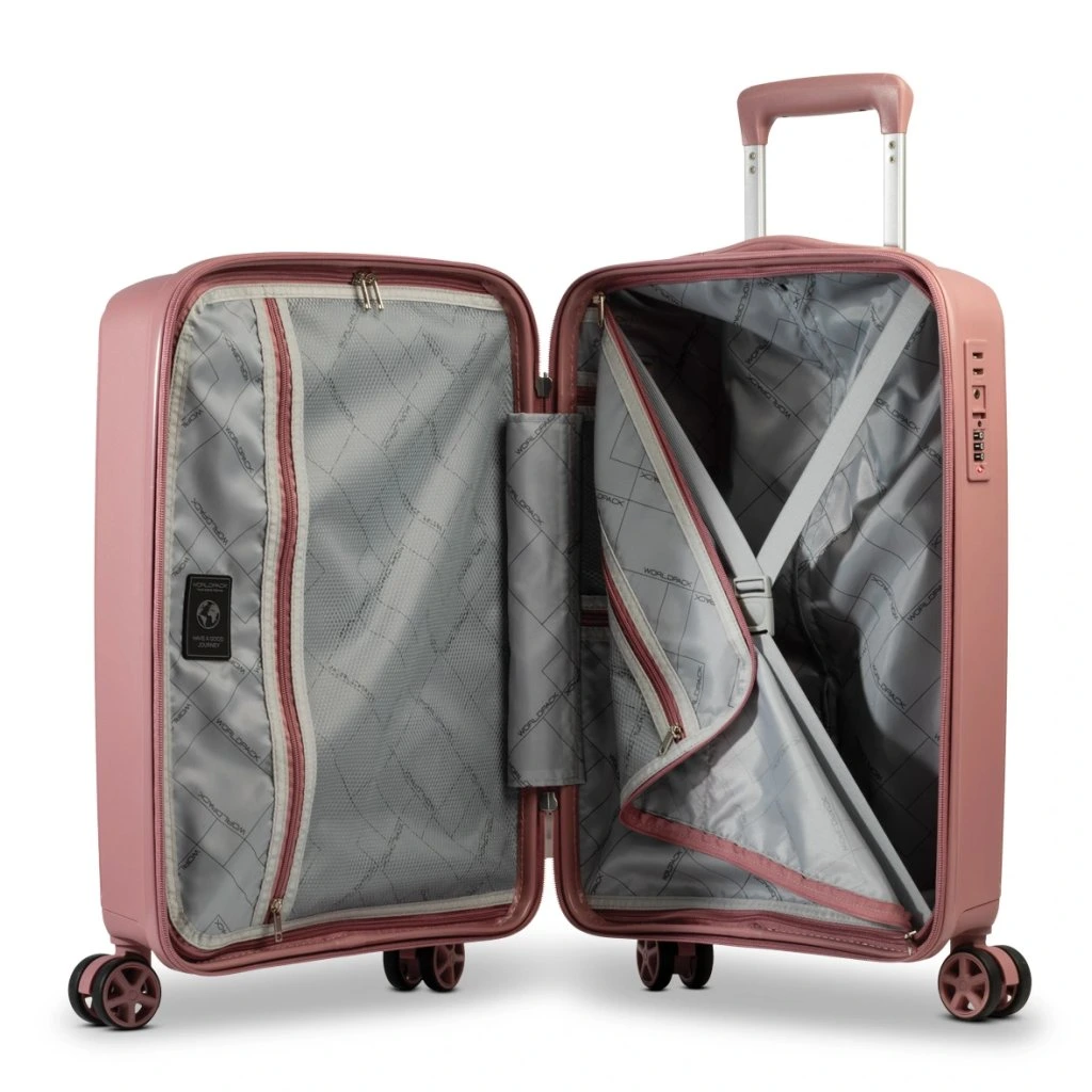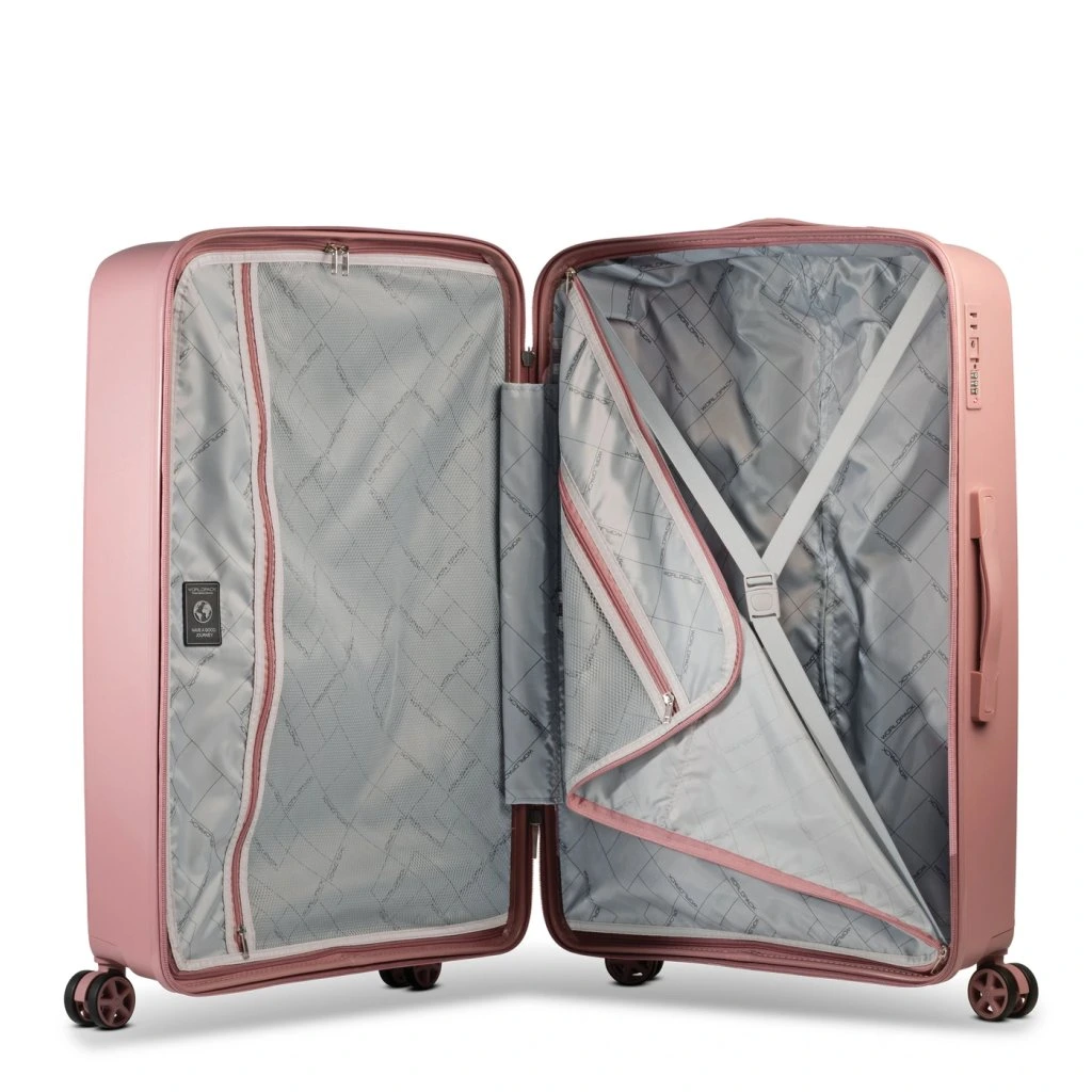 A bőröndök tartós polipropilénből készülnek, amely megbízhatóan védi a tartalmát az ütődésektől. A négy forgó görgő, a teleszkópos fogantyú és a praktikus belső elrendezés kényelmes és problémamentes utazást tesz lehetővé.